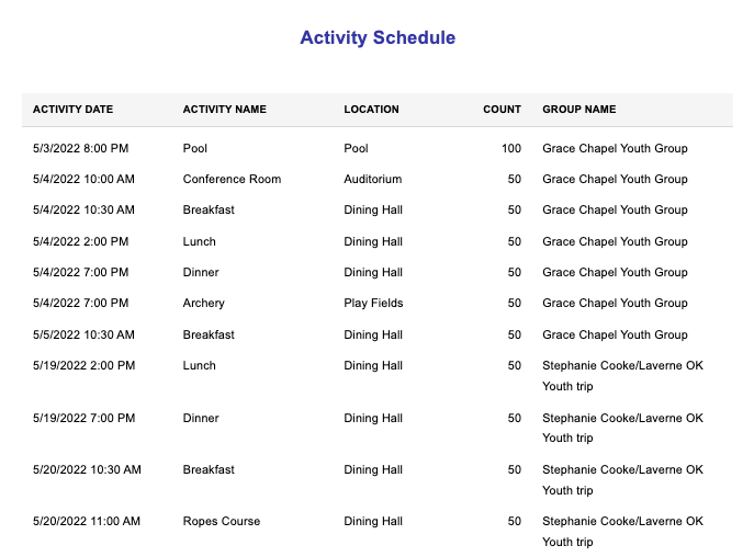The Activity Schedule shows the details of all activities scheduled for the date range, activities, and locations specified in the filtering criteria.