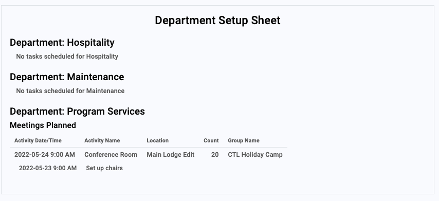 The Department Sheet provides details for each department that support the tasks they’ve been assigned for activities, meals and maintenance to support upcoming reservations.