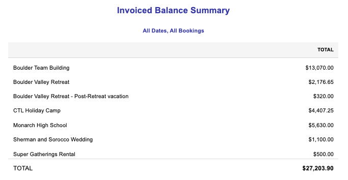 The Invoiced Balance Summary report shows a total invoiced balance due for each booking with a balance.