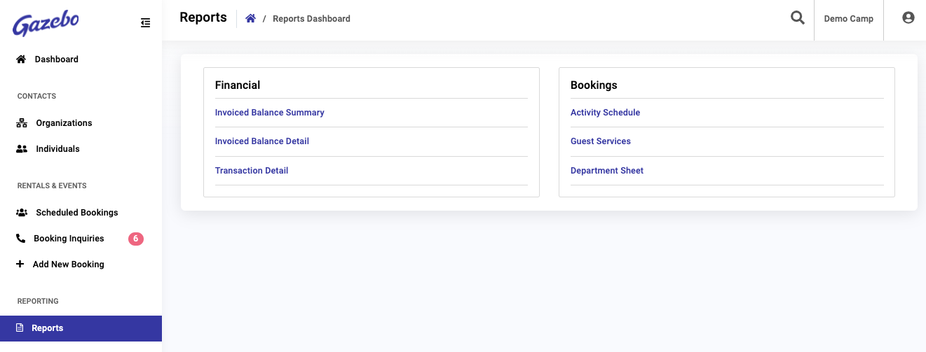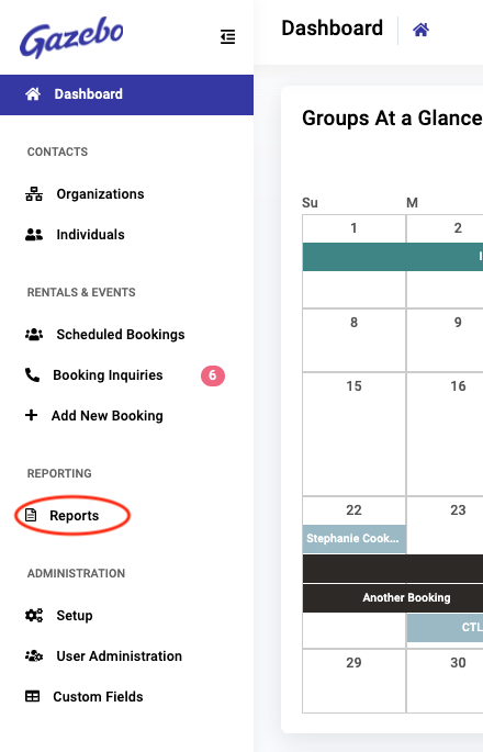 Gazebo reports are available from the Reports link in the main navigation. There are two categories of reports: Financial Reports and Bookings Reports.