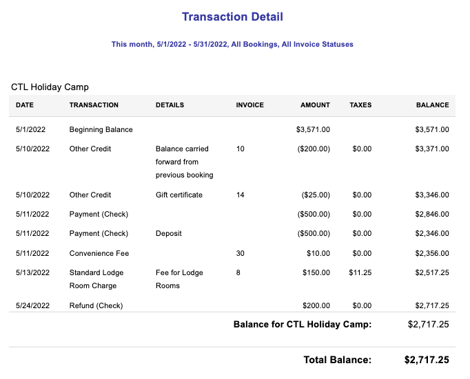 The Transaction Detail report is like a ledger for a booking.