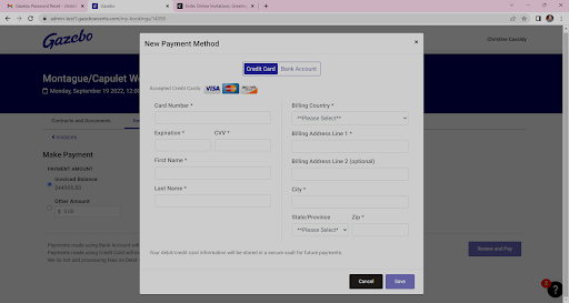 From the Organizer Portal, payments can now be made directly from the Invoices tab. Organizers are able to pay by using a Credit Card or Bank Account through the “Add New Payment Methods” function.