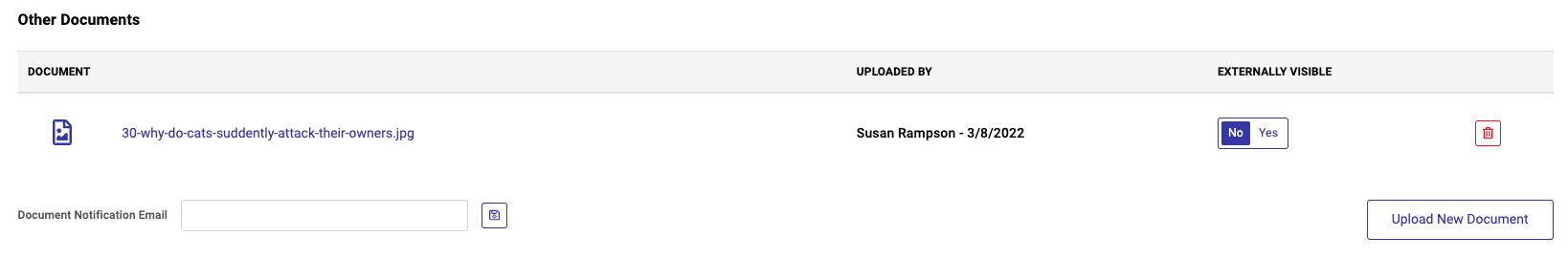 - Select No or Yes on the toggle to indicate whether or not the document should be visible via the portal.